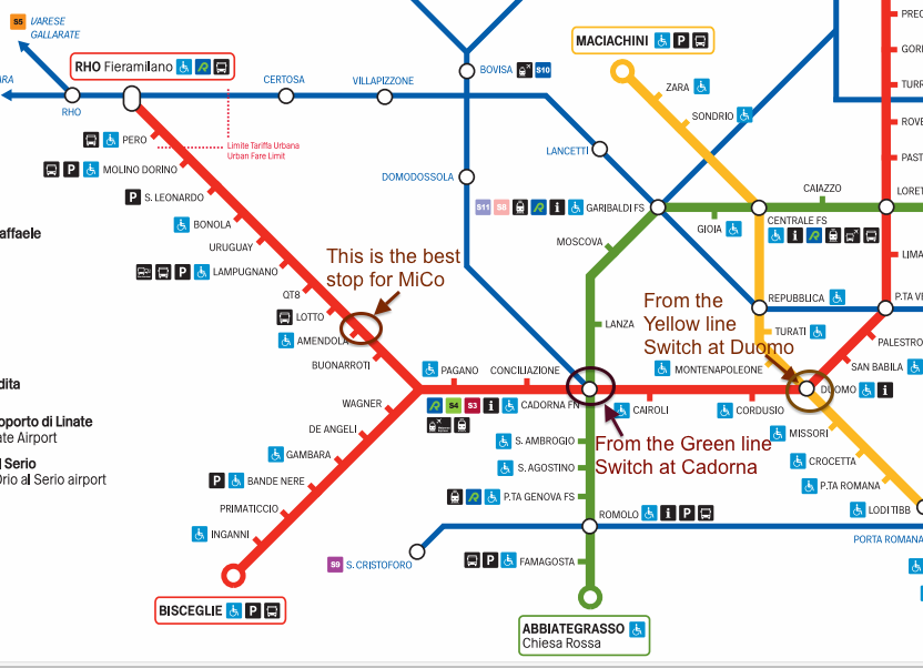 The Metro station serving the conference centre is Amendola which is on the west bound red line (M1) of the Metro. The train that goes there is named after the last stop (as are they all), the last stop being RHO Fiera Milano. Take care that there are two trains westbound on the red line, the other one is marked Bisceglie and does not go to the conference centre since the lines split up after Pagano, one going north west while the other goes south west. Travelling from Cadorna station to Amendola will take roughly 10 minutes.